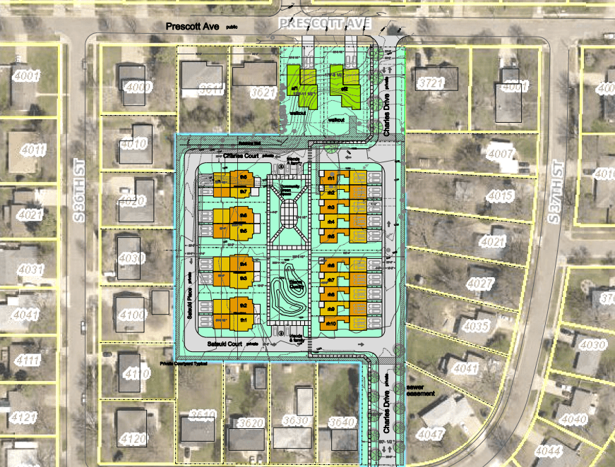 The bottom left image of rowhomes in the Fallbrook neighborhood in Northwest Lincoln were designed by Peace Studio Architects, and used as an example for the 10 Azalealand rowhomes.